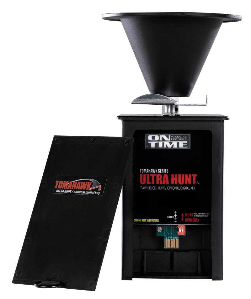 The Tomahawk Ultra Hunt is a waterproof wildlife feeder with high-impact composite construction and a heavy-duty motor, designed for hunting applications. It offers multiple operation modes including dawn-dusk mode and hunt mode with up to 20 feedings per day, plus programmable control for up to 4 feedings daily at 1-20 second durations. Features a 360-degree spinner mechanism, 6-volt battery operation, and universal mounting capability.
