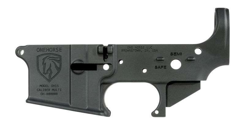 AR15 stripped lower receiver manufactured by One Horse in anodized aluminum finish. This is the serialized firearm component required to legally complete an AR15 rifle build. Suitable for most standard AR15 upper receivers and components.