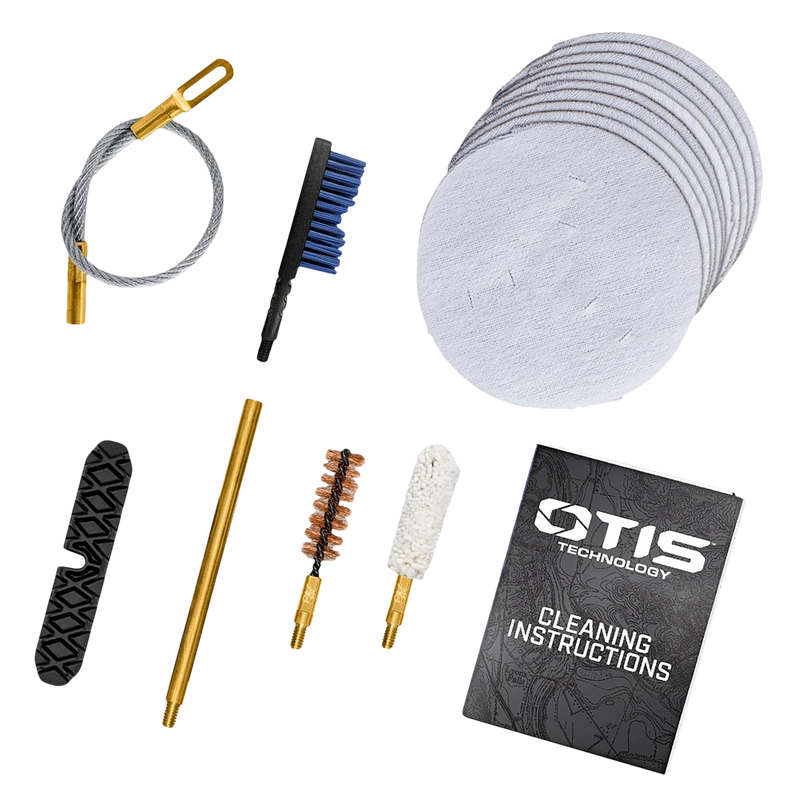 The Otis Patriot Series Cleaning Kit is designed for .45 caliber pistols and includes 15 pieces with a Memory-Flex cable, slotted tip, bore mop, and interchangeable bits. Features a multi-function T-handle that acts as both a handle and driver for included bits. Made in the USA and packaged in a hard plastic case for storage and portability.