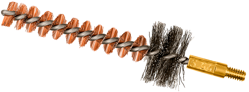 Chamber brush designed for 5.56mm NATO/.223 caliber rifles with 8-32 thread compatibility. Features tapered bronze bristles for scrubbing the chamber neck and shoulder, with steel bristles at the base to clean the star chamber of the locking lugs. The brass stem is cold welded to the core with a folded tip for durability.