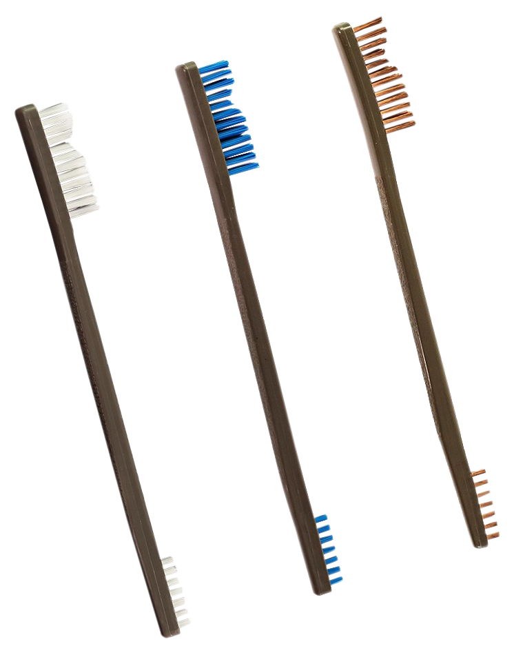 This three-piece variety pack from Otis Technology includes all-purpose receiver brushes with bronze and nylon bristles designed for universal firearm cleaning. The brushes are suitable for general gun care and maintenance across different firearm types. The set combines multiple bristle materials to handle various cleaning applications.