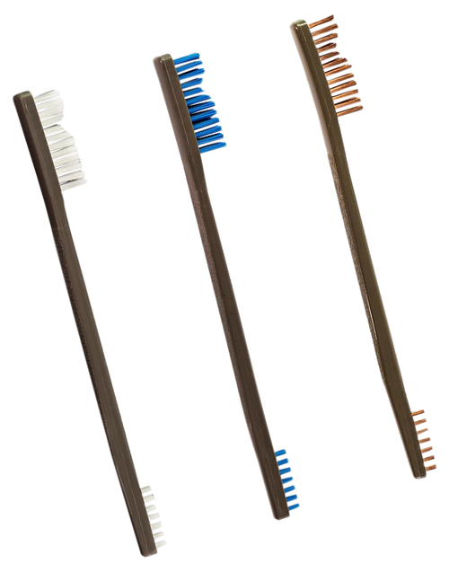 This 3-piece brush set from Otis Technology includes two nylon bristle brushes and one blue nylon brush, designed for firearm cleaning and maintenance. The brushes are compatible with Otis cleaning rod systems and effectively remove fouling and debris from firearm bores and components. Dimensions are approximately 8.8" in length with a 2.2" width.
