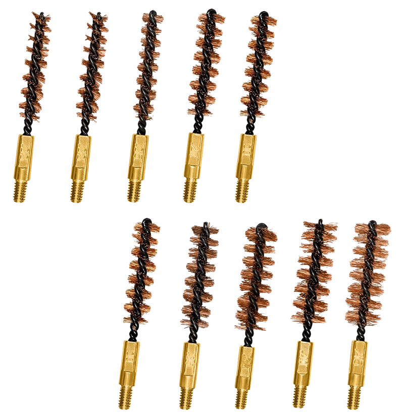 This 10-pack variety brush set includes bronze bristle brushes sized for multiple calibers from .22 to .45, designed for cleaning rifle and pistol bore chambers. The brushes are made with bronze bristles to avoid scratching firearm barrels and come in a protective case for storage and portability.