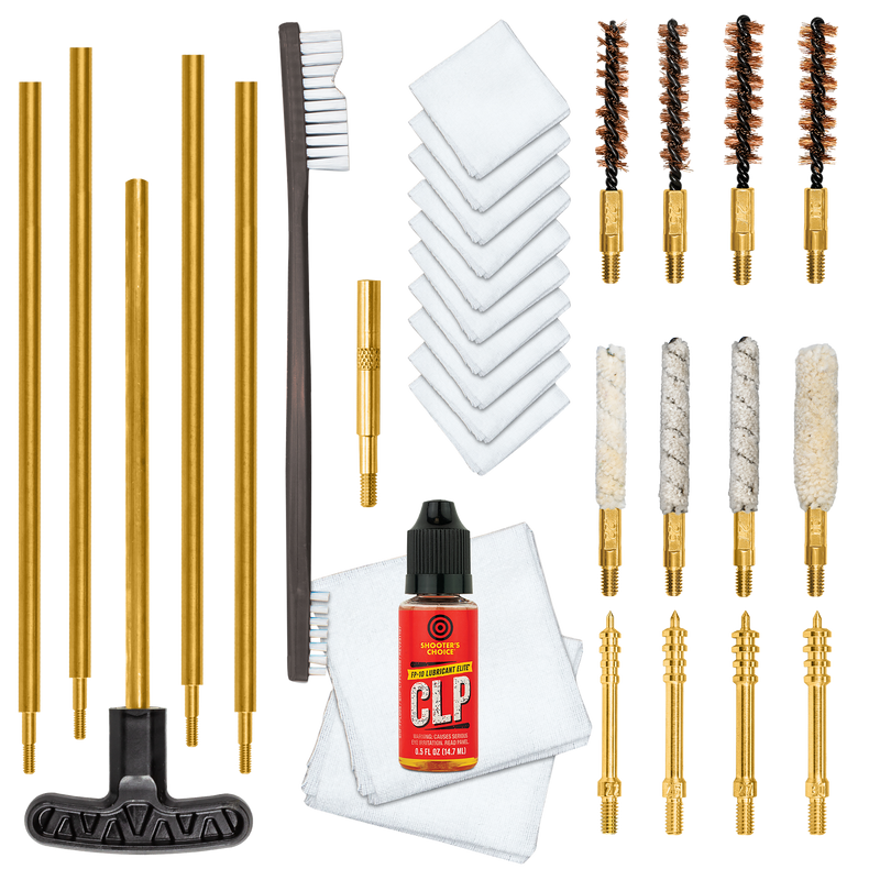 This multi-caliber rifle cleaning kit from Otis Technology is designed for cleaning rifles across various calibers. It features bronze bristles with pierce point tips for effective bore cleaning. The kit comes in a compact carrying case measuring 8.6" x 5.0" x 1.8".