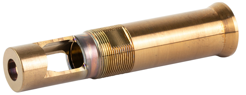 The OTB is a muzzle brake and OPS pattern mount adapter made from H900 heat treated 17-4 steel, designed as a one-piece solution for mounting compatible suppressors to barrels with 5/8x24 threads. It accommodates barrels with 0.75" or less outer diameter and requires a minimum of 2.05" of exposed barrel measured from the shoulder. The raw heat treat finish provides a durable, corrosion-resistant surface.