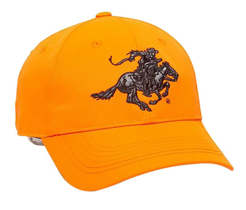 Structured snapback cap featuring Winchester branding in orange polyester twill material. One size fits all design with adjustable snapback closure for a customizable fit. Dimensions are 6.0" length x 4.0" width x 3.0" height.