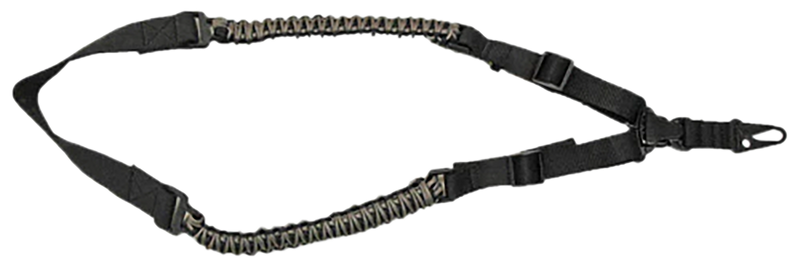 The Outdoor Connection Sling is a tactical rifle sling featuring 550 braided paracord with 1" mil-spec webbing and quick-detach push-button swivels. It offers one-handed adjustment capability and extends fully to 43", providing versatile carry options for hunting and tactical applications.