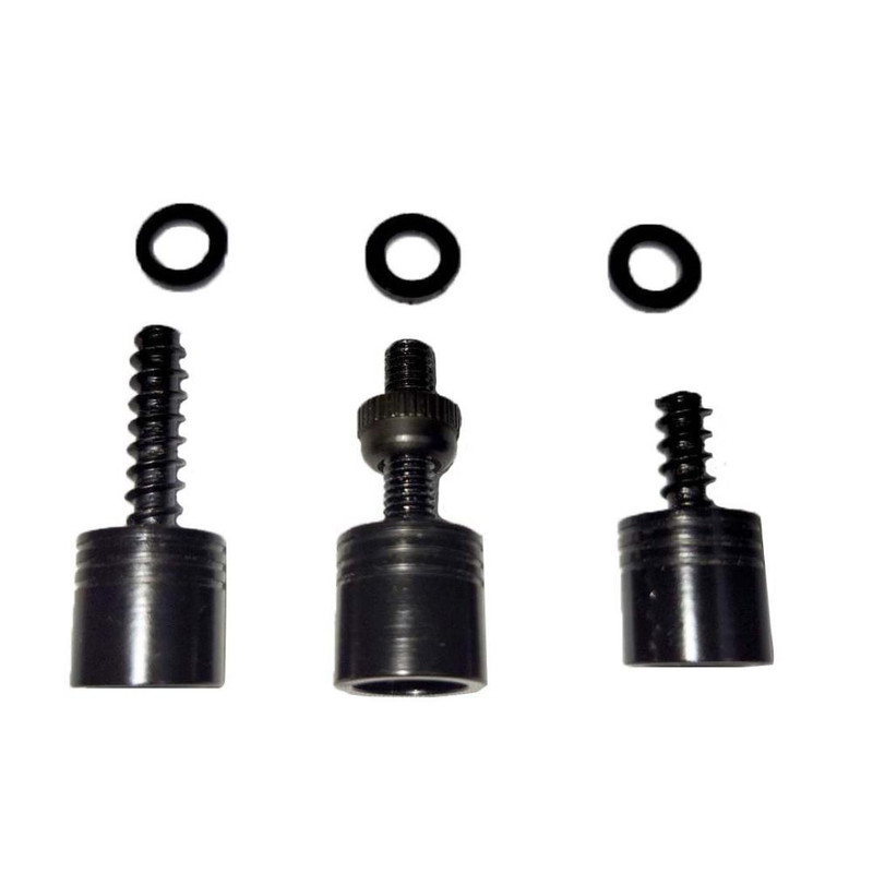 Quick-detach swivel base system featuring three mounting options: 3/4" wood screw, 1/2" wood screw, and 3/4" machine screw with knurled nut and black spacers. Designed for rifle scope mounting and firearm accessory attachment. All components finished in black.