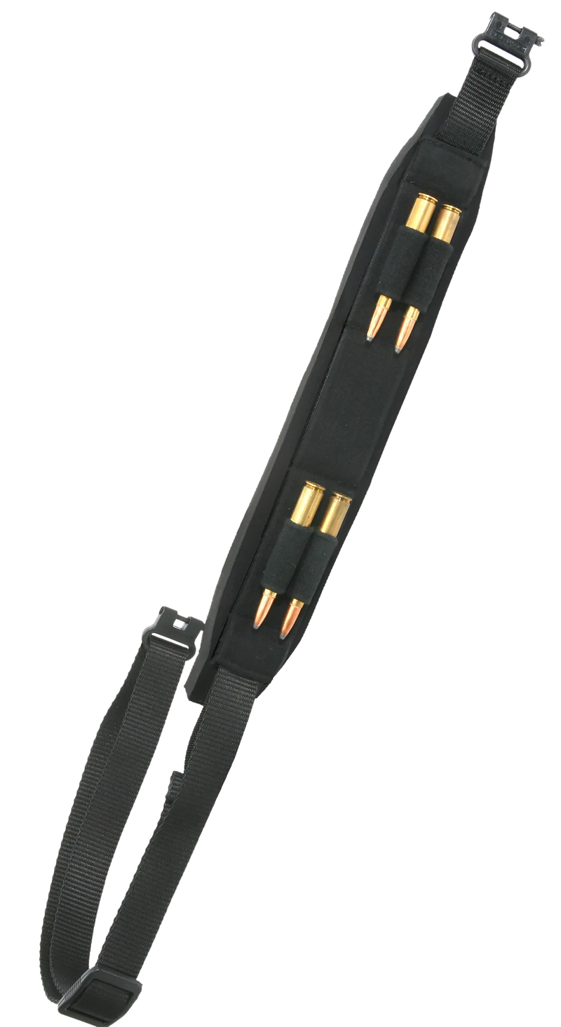 The Neo Magnum Sling is a 3.25" wide neoprene rifle sling with adjustable length to fit various shooting positions and body types. It features four rifle cartridge loops and heavy-duty Brute Swivels for secure attachment to rifles and shotguns. The neoprene construction provides comfort and durability for extended use in the field.