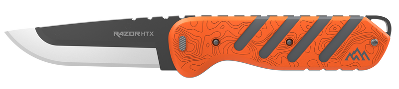 The Outdoor Edge Razor HTX is a fixed blade knife featuring a 3.5" plain edge 420J2 stainless steel blade with an orange and gray rubberized aluminum handle. This multi-blade system includes three drop point blades, two black bone blades, one gutting blade, and one saw blade pod housed in an included sheath. The matte finish blade and ergonomic handle design make it suitable for field dressing, general cutting, and outdoor tasks.