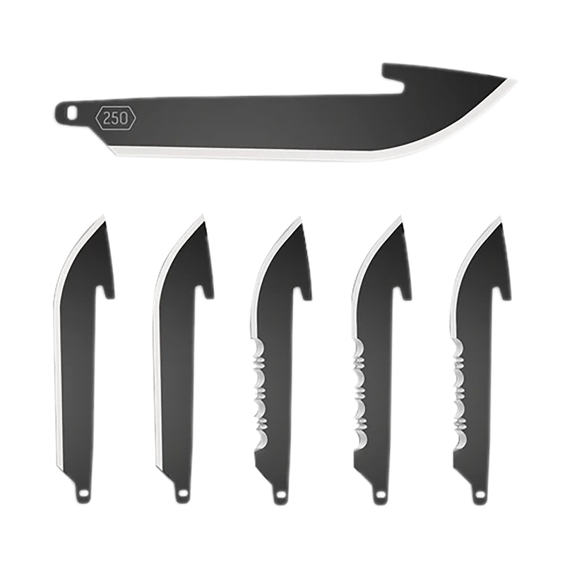 This 6-pack of replacement blades features 2.5" drop point blades with a plain/serrated edge combination, crafted from 420J2 stainless steel with black oxide finish. Designed as replacement blades for Outdoor Edge folding knife systems, these blades offer versatility for various cutting tasks. The combo pack includes both plain and serrated blade options for different cutting applications.