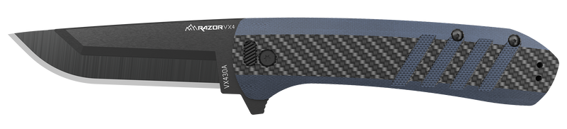 The Outdoor Edge Razor VX4 is a 3-inch folding knife featuring a 420J2 stainless steel blade with a plain edge and a carbon fiber and blue G10 handle. It includes interchangeable blades (3 standard plain edge and 1 partially serrated), a ceramic ball bearing system for smooth deployment, and a reversible deep carry clip for versatile carry options.