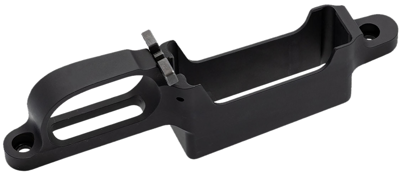 M5 long-action rifle stock made from black anodized aluminum with dimensions of 9.6" length, 3.8" width, and 1.8" height. This chassis-style stock is designed for precision rifle applications and provides a lightweight aluminum platform for M5 compatible actions. Installation details and specific mounting information should be verified with manufacturer specifications.