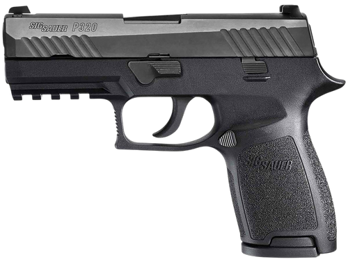 The SIG SAUER P320 Compact is a 9mm striker-fired semi-auto pistol with a 3.9" barrel and 15+1 round capacity. Features a polymer frame, Nitron finish, Siglite night sights, and optic-ready slide. This compact duty pistol weighs 26 oz. and measures 7.2" overall length.