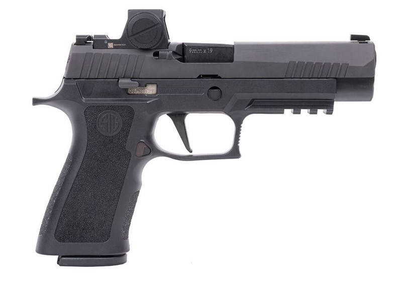 The SIG SAUER P320 Full is a 9mm striker-fired semi-auto pistol with a 4.7" barrel and 17+1 capacity. Features a polymer frame, Nitron finish, X-Ray 3 night sights, and is optic-ready with a Romeo-X red dot mount. Weighs 28.3 oz and includes three 17-round steel magazines.