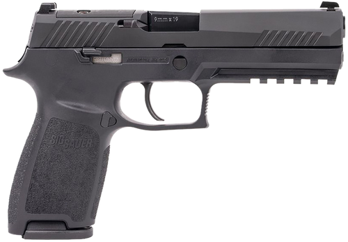 The P320 Full TACPRO is a 9mm striker-fired semi-auto pistol with a 4.7" barrel and 17+1 round capacity. Features a polymer frame, Nitron finish, Siglite night sights, and is optic-ready for tactical versatility. Includes a Savior bag and five 17-round steel magazines; weighs 29.4 oz with an overall length of 8".
