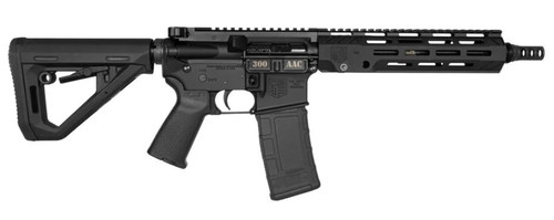 Semi-auto short barrel rifle chambered in 300 AAC Blackout with a 10.5" threaded barrel and 1-in-8 twist rate. Features a Gen4 billet lower receiver, 9" M-Lok rail, short-stroke piston system, triple port muzzle brake, and collapsible Mission First Tactical stock. Weighs 6.3 lbs and comes with one 30-round magazine; NFA registration and SOT dealer required.
