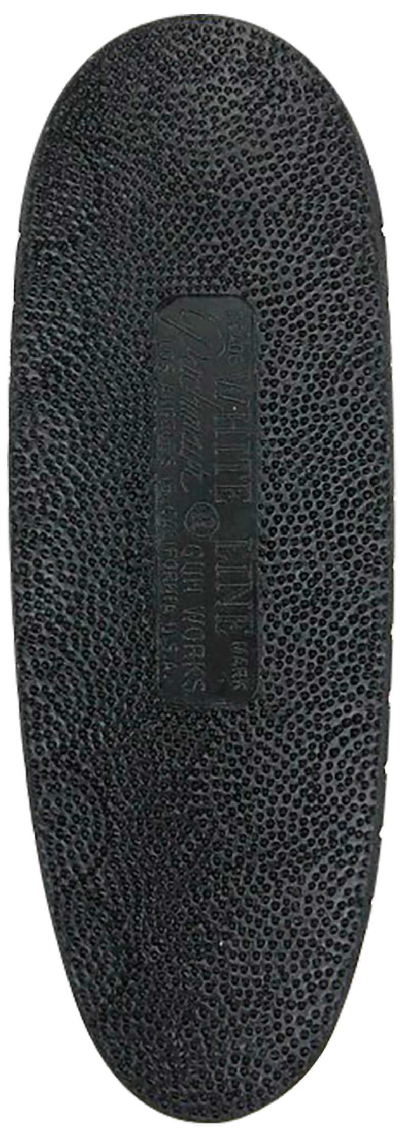 The Pachmayr F325 Deluxe is a medium-sized rubber recoil pad designed for rifles and shotguns, featuring a classic stippled face for non-slip performance and a softer side for collarbone comfort. Measuring approximately 10.1" length × 3.5" width × 1.5" height, this field-style pad mounts quickly and effectively absorbs recoil. The black finish with white line base provides durable protection and easy visibility for mounting.