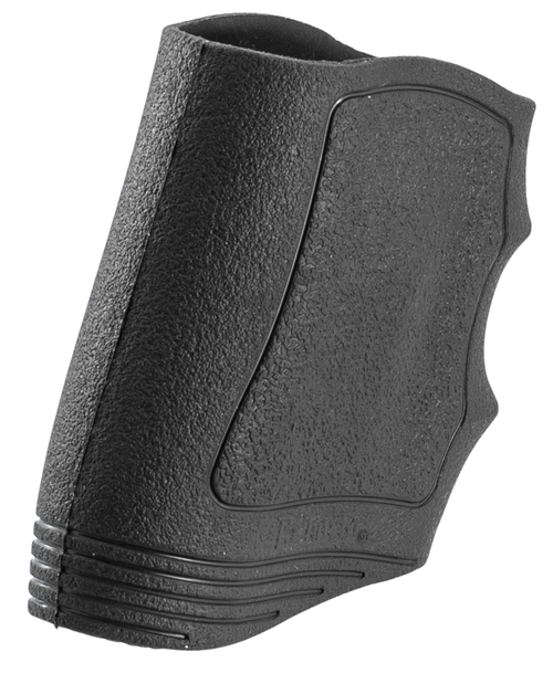 Universal slip-on grip designed to fit medium to full-size pistols including Glock and other polymer frame pistols. Features non-slip texture, palm swells for control, and molded trim lines for custom fitting. Not suitable for pistols with grip safeties.