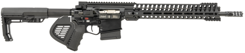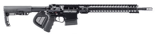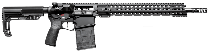 Semi-automatic rifle chambered in .308 Winchester with a 16.5" chrome moly barrel and 1:10 twist rate. Features a direct impingement operating system, 9-position Dictator adjustable gas block, Mission First Tactical Minimalist stock, and triple-port muzzle brake. Includes optic-ready upper, ambi mag release and bolt catch, nickel-plated bolt carrier, and weighs 6.81 lbs with an overall length of 34".