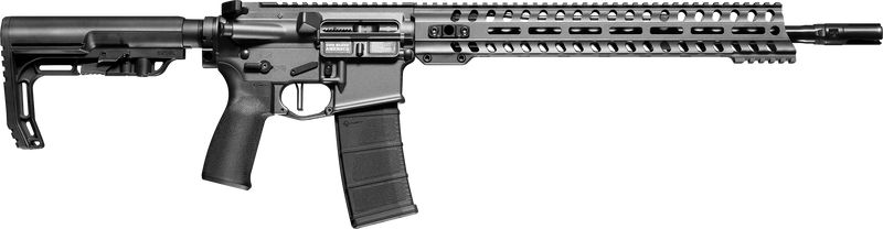Semi-auto tactical rifle chambered in 5.56x45mm NATO with a 16.5" match-grade black nitride barrel and 1:8" twist rate. Features a tungsten receiver, 14.5" M-Lok handguard, 6-position MFT stock, and 3-prong flash hider. CA-compliant with 10+1 capacity, weighs 6.20 lbs, and ships with no sights installed.