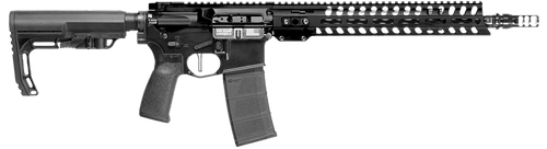 Semi-auto rifle chambered in 300 AAC Blackout with a 13.75" threaded barrel and 1:7" twist rate. Features a 13" Renegade rail, Dead Air Keymo muzzle brake, ambidextrous safety, match-grade trigger, and collapsible Mission First Tactical stock. Weighs 6.3 lbs with an overall length of 34".
