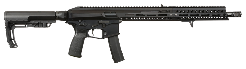 Semi-auto rifle chambered in 9mm Luger with a 16.5" threaded barrel and 10+1 capacity. Features a monolithic upper receiver with M-LOK slots, dual-chamber muzzle brake, Mission First Tactical collapsible stock, and Picatinny rails. Weighs 5.75 lbs with black Cerakote finish and ambidextrous controls.