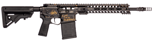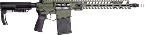 Semi-auto rifle chambered in .308 Winchester with a 13.75" nitride steel threaded barrel and 1-in-10 twist rate. Features a 13" Renegade rail system, Dictator adjustable gas block, Dead Air Keymo muzzle brake (pinned & welded), and Mission First Tactical collapsible stock. Weighs approximately 6 lbs with an overall length of 34".