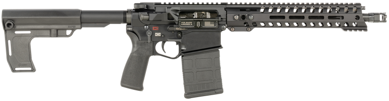 Semi-auto pistol chambered in .308 Win with a 12.5" black nitride barrel and 20+1 capacity. Features an MFT Engage V2 grip, Renegade forend, triple port muzzle brake, and adjustable gas block. Weighs 6.5 lbs with an overall length of approximately 29.5-30".