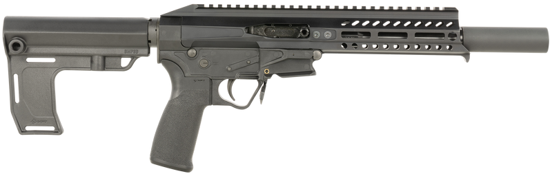 The POF PSG is a semi-auto .22 LR pistol with a 7.75" match-grade threaded barrel and 10+1 capacity. It features a black anodized monolithic upper receiver with Picatinny rail, M-LOK handguard, MFT pistol stabilizer brace, and MFT grip. Overall length is 21.25" with a weight of 3.25 lbs.