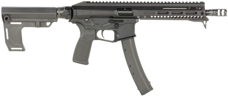 Semi-auto pistol chambered in 9mm Luger with an 8" threaded barrel and 35+1 capacity. Features a black anodized finish, MFT pistol stabilizer brace, 2-port muzzle brake, and direct blowback operation. Weighs 4.8-5.5 lbs with an overall length of 17.5".