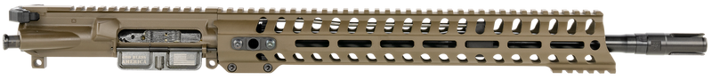 Complete AR-15 upper assembly featuring a 16.50" 4150 Chrome Moly Vanadium Steel barrel with black nitride finish and mid-length direct impingement gas system. Includes a 14.50" M-LOK aluminum handguard in Patriot Brown, low-profile gas block, and optic-ready flat-top receiver. This drop-in upper is compatible with standard AR-15 lower receivers and requires no gunsmithing for installation.