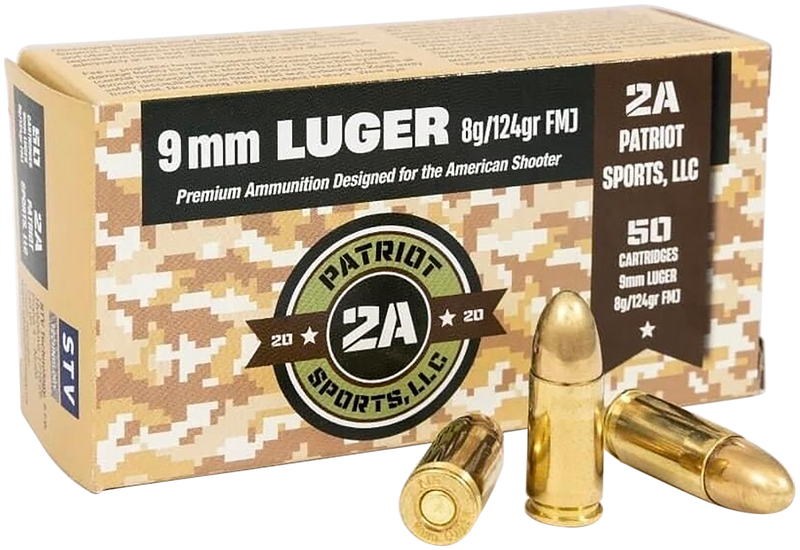 Patriot Sports 9mm Luger 124 grain Full Metal Jacket ammunition with brass casing, loaded to 1148 fps. Each box contains 50 rounds and is suitable for recreational shooting, sport training, and duty use. Manufactured on state-of-the-art equipment using premium components.