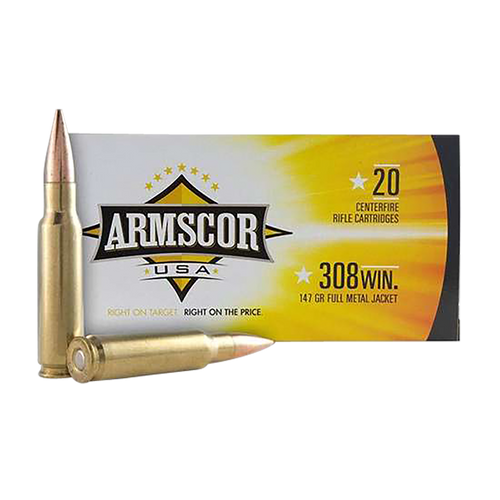Patriot Sports LLC 308 Winchester ammunition loaded with 147-grain full metal jacket bullets. Offered in 20-round boxes with 50 boxes per case, ideal for target practice and training applications.