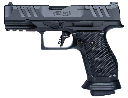 The Walther PDP Compact is a 9mm striker-fired semi-auto pistol with a 4" barrel and 10+1 capacity. It features an optics-ready slide, adjustable Glock-cut sights, and a performance duty trigger with textured polymer grip. Weighing 24.4 oz with a 7.5" overall length, this polymer-framed pistol delivers reliable performance in a compact package.