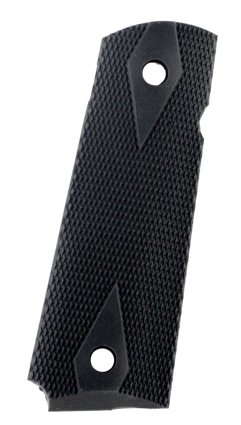 Side panel grips designed for 1911 Government model pistols, constructed from soft rubber with double diamond checkering pattern. Features ultra-slim profile with palm swell for improved grip control and comfort while reducing overall frame width.