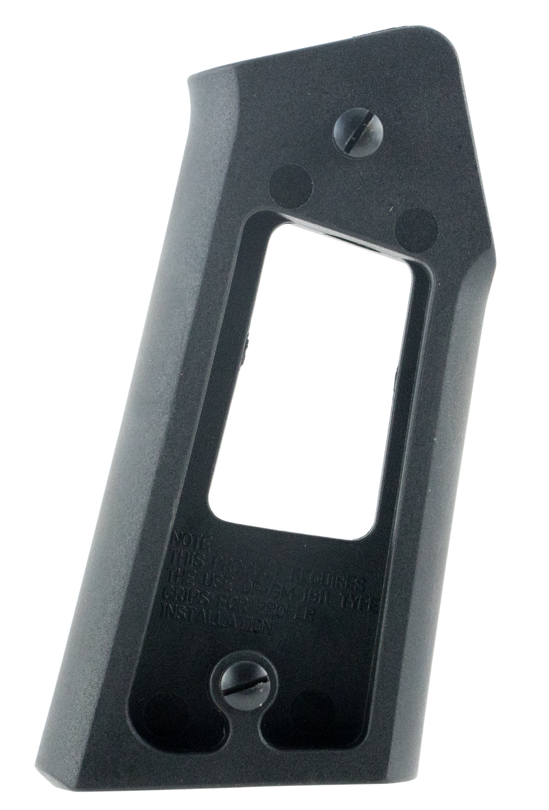 This grip adapter allows AR-15 and M16 series firearms to accept Government Model 1911 side panel grips, converting the grip angle to match the 1911 configuration. Made from black polymer, it measures approximately 5.0" length × 3.5" width × 1.4" height and installs by replacing the standard AR-15 pistol grip. Users can customize grip fit by selecting from various 1911-compatible grip panels.