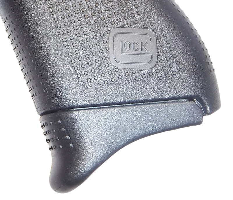 This grip extension for the Glock 43 (9mm Luger) replaces the magazine floor plate and adds approximately 3/4 inch of length for improved control and comfort without altering magazine capacity. Constructed of textured polymer with an ergonomic curve, it is slightly longer than the factory extension and maintains the factory texture pattern.