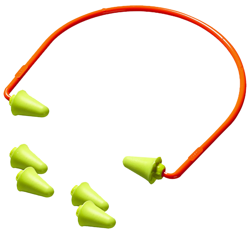 Foam banded earplugs with a 28 dB Noise Reduction Rating (NRR) designed for hearing protection in high-noise environments exceeding 85 decibels. The behind-the-head band style offers flexible wearing positions compatible with hats and helmets, while soft washable plugs provide comfort without added weight. Each earplug detaches easily for cleaning and replacement.