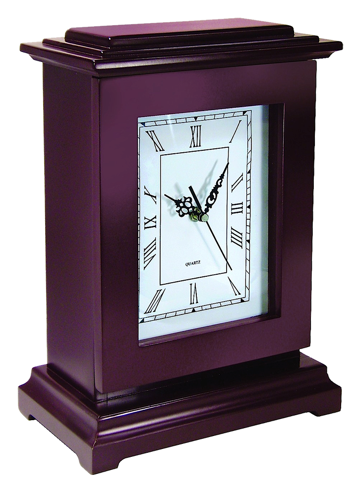 This concealment clock safe holds one large handgun and other valuables in solid mahogany wood construction. Features a magnetically latched front panel entry and reliable quartz clock movement, requiring one AA battery (included). Dimensions are 13.25" L x 9.50" W x 6.25" D.