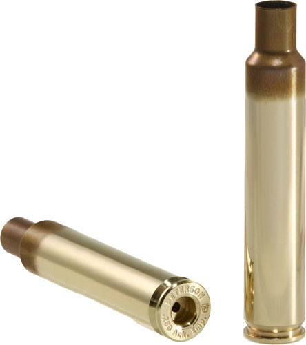 Peterson unprimed brass cartridge cases designed for 280 Ackley Improved reloading. Sold in 50-round packs with 10 boxes per case for bulk purchasing. These cases are ready for hand loading with primers, powder, and projectiles.