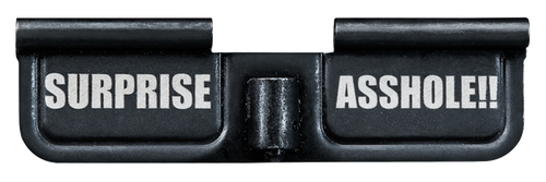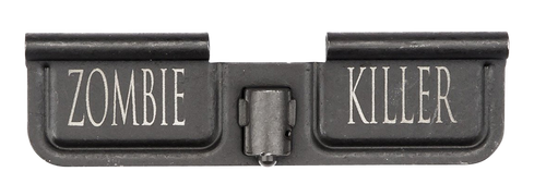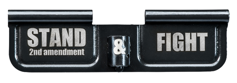 Ejection port door designed for AR-15 platform rifles, constructed from black parkerized steel with 3.10" width. Features "Stand & Fight" engraving. This dust cover accessory provides protection for the ejection port when not in use.