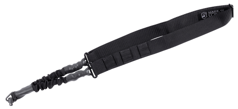 Single point sling featuring a quick-detach (QD) swivel attachment and elastic shock-cord bungee construction. Black nylon strap is adjustable from 24.50" to 33.50" overall length. Designed for versatile weapon carry and retention on tactical rifles and carbines.