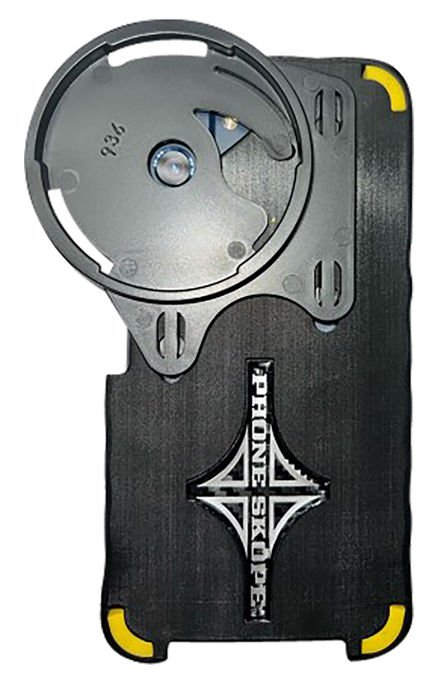 The Phone Skope U1 is a mini-sized optic adapter designed to connect smartphones to rifle scopes and other optics for digiscoping applications. This black adapter measures 5.1" x 4.1" x 2.3" and provides a compact solution for capturing images and video through your scope.