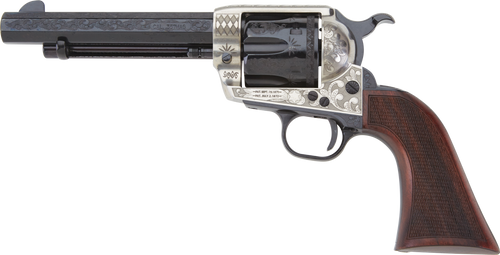 The Pietta Alchimista Jr is a single-action revolver available in .357 Mag or .45 Colt with a 3.5" round barrel and 6-round capacity. This model features an Old Silver and Blue two-tone engraved finish, checkered express grip assembly, wider set-back trigger, and lower wider hammer for improved ergonomics.