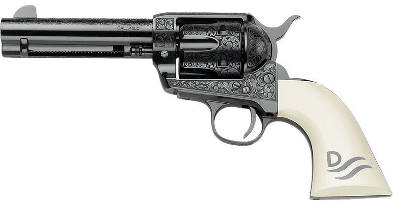 Single-action revolver chambered in 45 Colt (Long Colt) with a 4.75" barrel and 6-round capacity. Features an exposed hammer, ultra ivory engraved grips, and classic Great Western II styling. Dimensions: 14.6" overall length, 3.0" height, 6.6" width.
