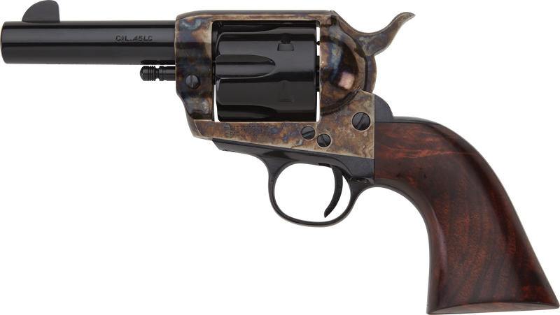 Single-action revolver chambered in 45 Colt (Long Colt) with a 3.50" blued steel barrel and cylinder, color case hardened steel frame, and walnut grip. Features an exposed hammer and blade front sight. This 6-round classic-style revolver measures 14.6" overall with a 6.8" width.
