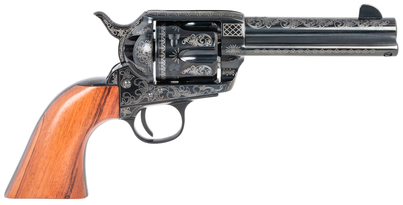 Single-action revolver chambered in 45 Colt (Long Colt) with a 4.75" blued and engraved barrel, 6-round capacity, and exposed hammer. Features a blued and engraved steel frame with walnut grips and blade front sight, combining classic 1873 styling with modern manufacturing. Dimensions: 14.7" overall length, 2.9" height, 6.6" width.