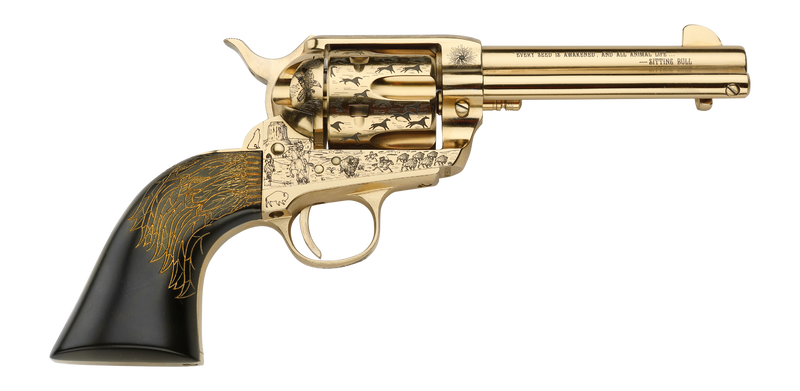 The Pietta Keeper of the Plains is a 357 Magnum revolver with a 4.75" barrel featuring gold engravings and traditional Native American lithographic art on the solid black grips and side plate. This single-action revolver pays tribute to Plains Indian heritage with detailed scenes and eagle feathering designs.