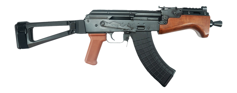 Semi-automatic pistol chambered in 7.62x39 with a 7" barrel and 30+1 round capacity. Features an adjustable rear sight, post front sight, aluminum Picatinny top rail, Krinkov-style muzzle device, orange polymer pistol grip, and side-folding pistol brace. Gas piston operating system with internal hammer.